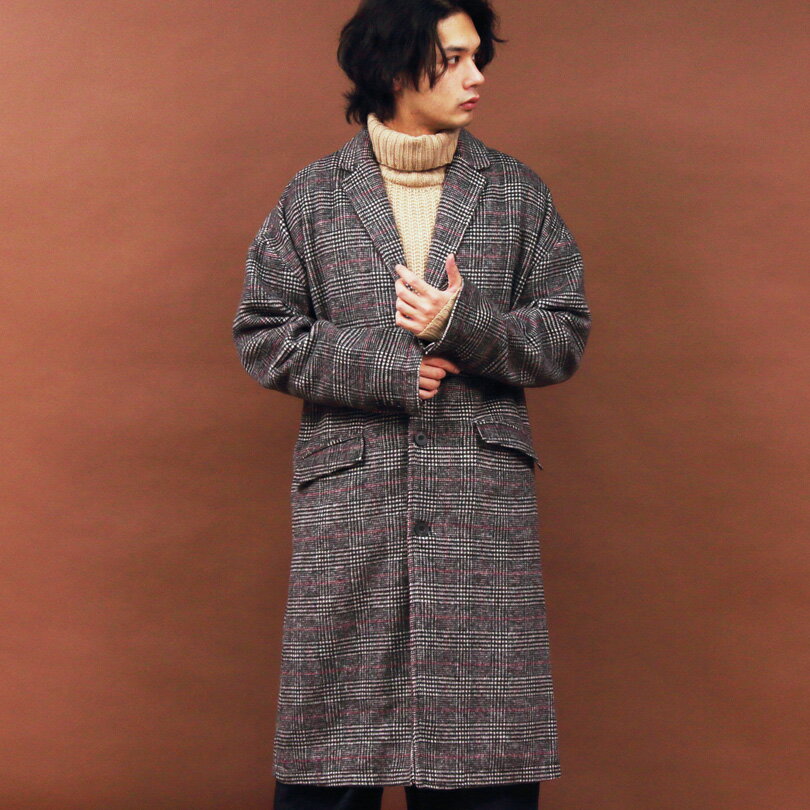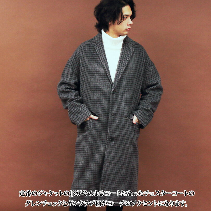 送料無料! チェスターコート メンズ コート チェスター アウター 全4色 新作 コート チェック オーバーサイズ ウール メルトン 防寒 通学 に◎ グレンチェック ガンクラブ ストリート アメカジ に大人気! 大きいサイズ M L 8(eight) エイト 8